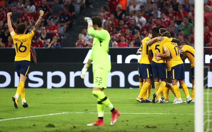وسجل لأتلتيكو من ركلات الترجيح كل من جريزمان وتوريس وجابي ونيكولاس جايتان وفيليبي لويس، فيما أحرز للفريق الإنجليزي فيرمينو وأوريجي وكينت وجروييتش، وأهدر له هندرسون ركلة.