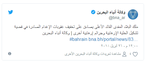 ونقلت وكالة الأنباء البحرينية عن رئيس القضاء العسكري اللواء يوسف راشد فليفل، قوله إن “ملك البلاد صدّق على تخفيف عقوبة الإعدام الصادرة بحق الجندي مبارك عادل، والمواطنين فاضل السيد عباس، وسيد علوي السيد حسين، ومحمد عبد الحسن المتغوي إلى عقوبة السجن المؤبد 25 عاما”.