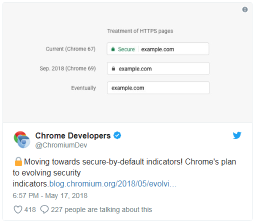 وبدءا من إصدار “كروم 69” في سبتمبر المقبل، سيتوقف المتصفح عن وضع إشارات الأمان: كلمة آمن ورمز القفل الأخضر، على شريط عناوين المواقع المشفرة، وستظهر المواقع فقط مع قفل رمادي اللون.