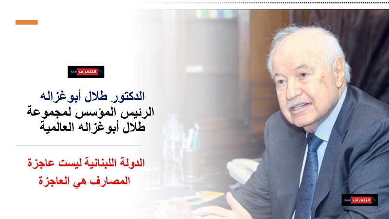 أكد الدكتور طلال أبوغزاله، الرئيس المؤسس لمجموعة طلال أبوغزاله العالمية، أن الدولة اللبنانية ليست عاجزة، بل المصارف هي العاجزة عن رد أموال المودعين، ما يعتبر جريمة مالية موصوفة وفريدة من نوعها في التاريخ.