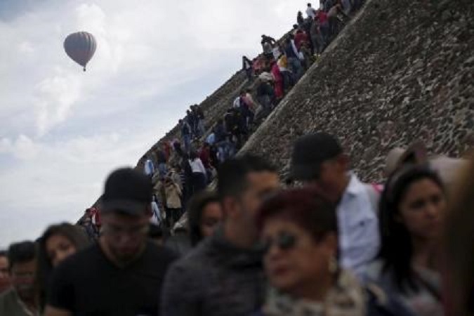 ارتقى عدد كبير من الزوار في ملابسهم البيضاء درجات هرم الشمس شمالي العاصمة مكسيكو سيتي لمشاهدة أول شعاع في اليوم احتفالا بالاعتدال الربيعي عندما تتساوى ساعات الليل والنهار.