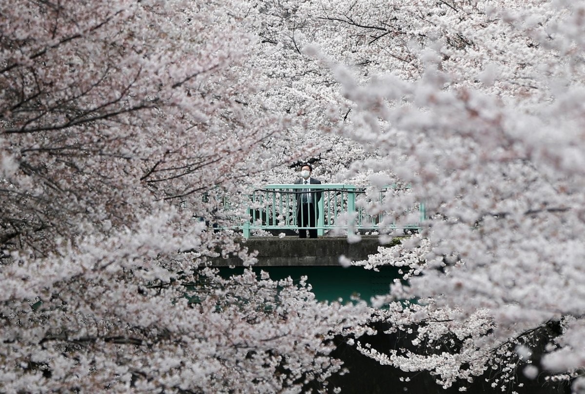 – رجل ينظر إلى أزهار الكرز في طوكيو باليابان، في 1 أبريل.