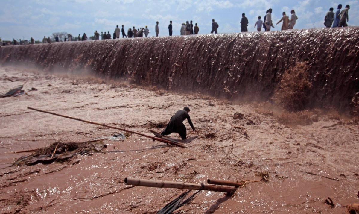 – صاحب متجر يحاول الحفاظ على ممتلكاته فيما يعبر السكان جسرا مغطى بمياه الفيضان في ضواحي بيشاور بباكستان، في 4 أبريل.