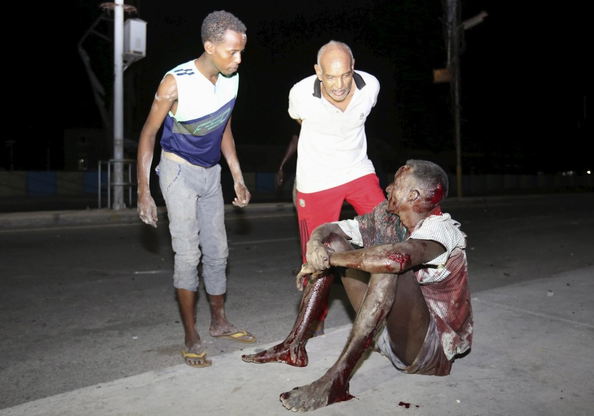 – رجل صومالي أصيب بجروح في هجوم انتحاري بسيارة بالقرب من فندق في منطقة حمروين يجلس على الرصيف بالقرب من مكان الحادث في مقديشو، الصومال، في 26 فبراير.