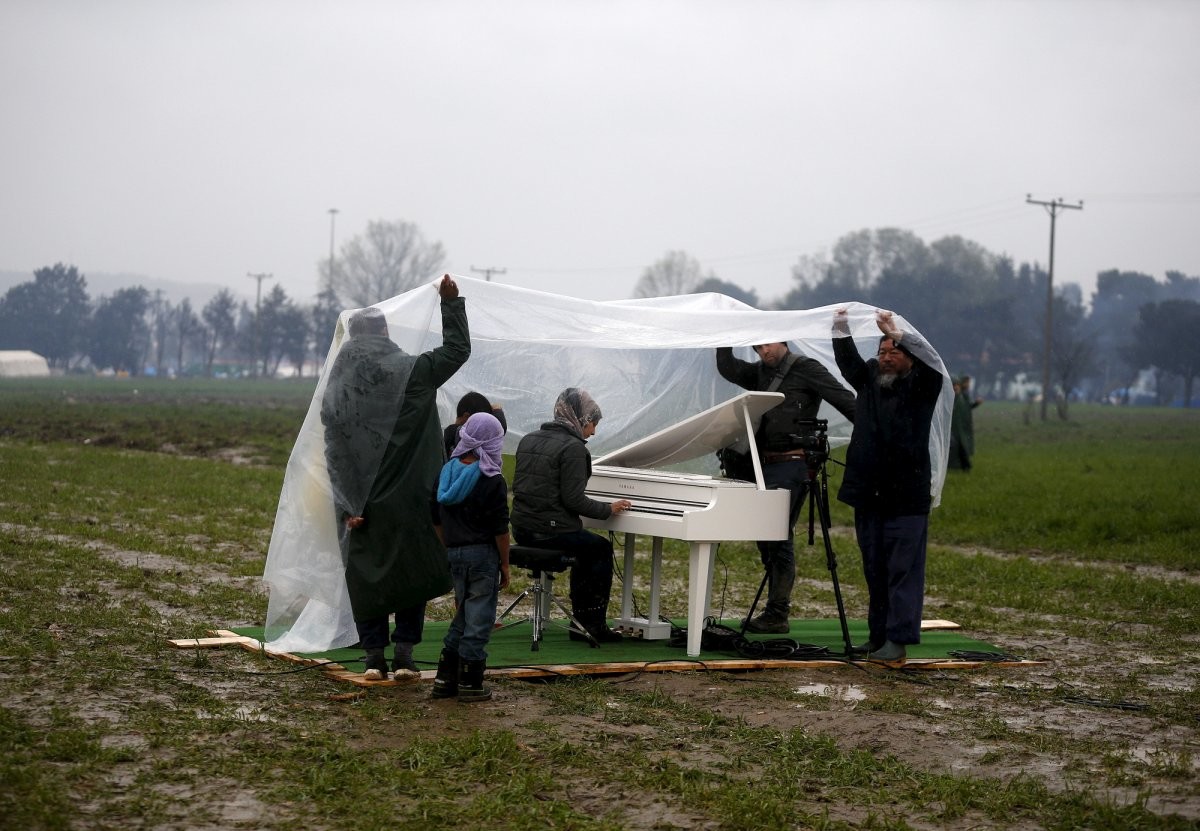 – الفنان والناشط الحقوقي الصيني آي ويوي يحمل غطاء المطر لحماية لاجئة سورية عندما كانت تغني في حقل وتعزف على البيانو بالقرب من مخيم مؤقت على الحدود اليونانية-المقدونية يوم 12 مارس.