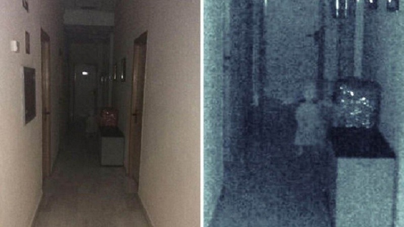 وخشي الرجل أن يكون هناك لصوص قد تسللوا داخل المبنى، فأخذ هاتفه للاتصال بالشرطة، ولكنه، وفقا لروايته، كان خائفا من تشغيل ضوء الهاتف فقام بالتقاط صورة لمدخل المبنى للتحقق مما إذا كان هناك أي شخص.