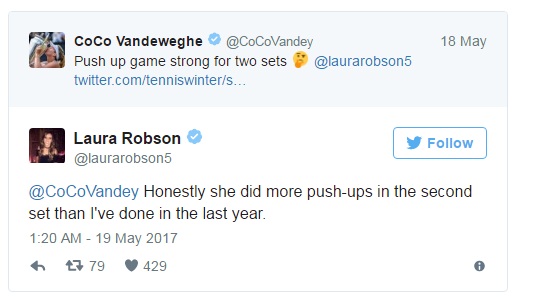 وسخرت روبنسون من منافستها اليابانية عبر حسابها الرسمي على تويتر وكتبت: “بصراحة لقد أدت تمارين الضغط خلال ثانية، أكثر مما قمت به خلال العام الماضي”.